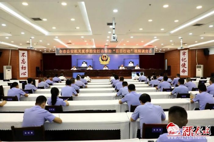 新天水讯【特约通讯员 李富军】8月16日,天水市公安局召开全市公安机关夏季治安打击整治“百日行动”调度会,深入贯彻公安部、省公安厅“百日行动”推进会议精神,全面落实市委市政府部署要求,通报前期工作,查找问题不足,就纵深推进“百日行动”、冲刺重点工作等进行调度。