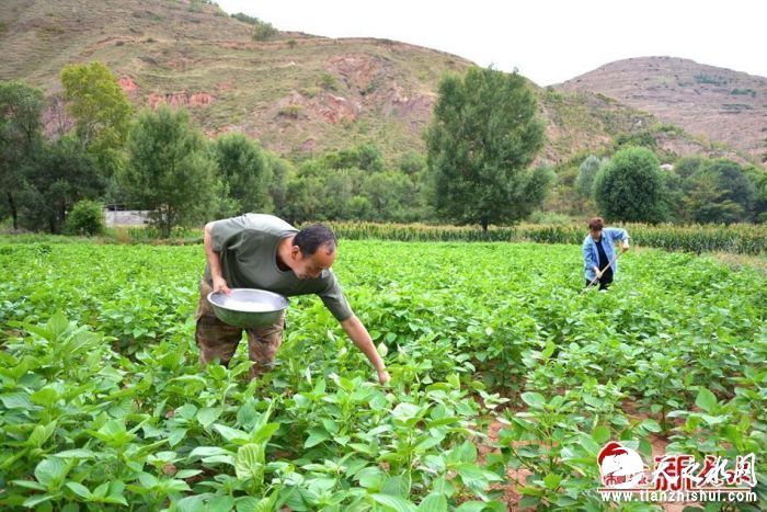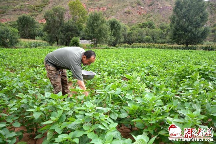 8月18日,武山县山丹镇漆河村村民在村集体种植的紫苏田里施肥、除草。据介绍,近两年紫苏价格一直居高不下,收购价一斤18元左右,亩产200多斤,收益比较可观。今年,漆河村抢抓机遇种植紫苏100多亩,村集体流转撂荒地十亩用于种植油菜、紫苏、冬小麦等粮食作物,实现了土地应种尽种和经济效益双赢。