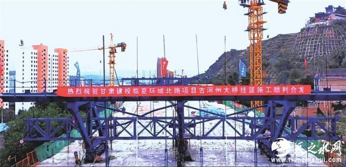 临夏市环城北路古河州酒厂段高架桥挂篮连续梁顺利合龙。
