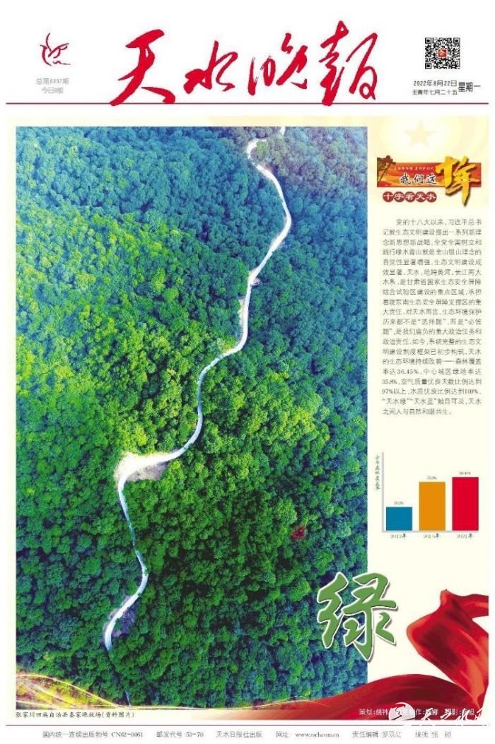 党的十八大以来,习近平总书记就生态文明建设提出一系列新理念新思想新战略,全党全国树立和践行绿水青山就是金山银山理念的自觉性显著增强,生态文明建设成效显著。天水,地跨黄河、长江两大水系,是甘肃省国家生态安全屏障综合试验区建设的重点区域,承担着陇东南生态安全屏障支撑区的重大责任。对天水而言,生态环境保护历来都不是“选择题”,而是“必答题”,是我们肩负的重大政治任务和政治责任。如今,系统完整的生态文明建设制度框架已初步构筑,天水的生态环境持续改善——森林覆盖率达36.45%,中心城区绿地率达35.8%,空气质量优良天数比例达到97%以上,水质优良比例达到100%,“天水绿”“天水蓝”触目可及,天水之间人与自然和谐共生。