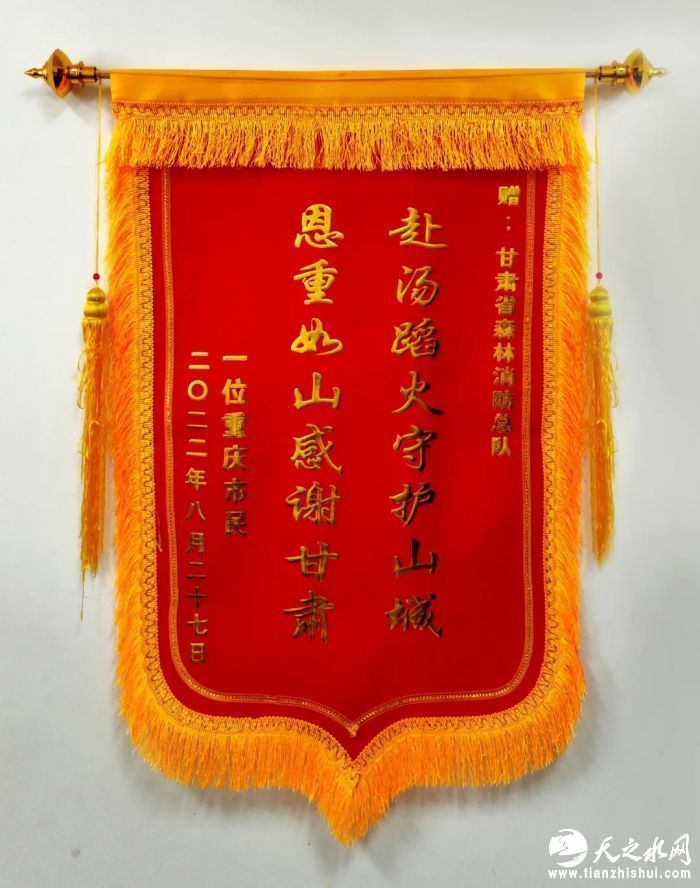 8月27日下午,一位重庆市民将绣着“赴汤蹈火守护山城 恩重如山感谢甘肃”字样的锦旗通过跑腿小哥送到了位于甘肃兰州的甘肃省森林消防总队,对总队在重庆扑救山火的指战员表示感谢。把人民褒奖作为最高荣誉,收到锦旗,既是鼓励,更是鞭策,人民群众用一面锦旗为全体指战员带来一堂无声的“职业荣誉感”授课,让全体指战员认识到了自身所从事的职业的神圣与光荣,加强了责任感和使命感。