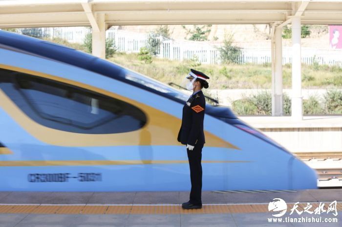 9月10日,宝兰高铁甘肃定西北站的工作人员在站台上送车。