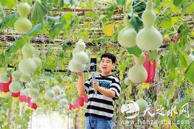 8月15日,甘肃陇南市成县陈院镇白马寺村,青年农民尚育康网上直播葫芦瓜生长,宣传特色家庭农场。 李旭春摄(人民图片)
