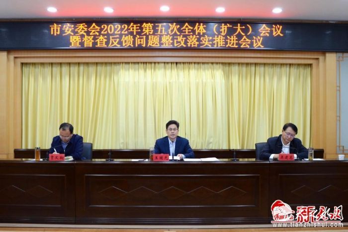 新天水讯【记者 王晓馨】9月19日,天水市委副书记、市长、市安委会主任王国先主持召开市安委会2022年第五次全体(扩大)会议暨省安委办督查反馈问题整改落实推进会议。省安全生产驻点包抓组组长、省公安厅二级巡视员吴建忠,市委常委、常务副市长贾义翔,副市长董小平、郭庆祥、胡志勇,市政府秘书长黎映广出席会议。