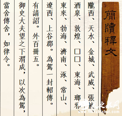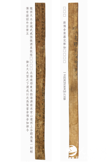 1991年出土于悬泉置遗址。木简一枚(简号Ⅰ91DXT0309③:135AB),该简左右均有残缺,长23.2、宽1.3、厚0.2厘米,松木材质。正面为两行书写,反面一行书写。此简当属传信简,是秦汉时期朝廷公务人员在出使、巡行及办理有关公务时要求所到各地给予通行、过关、乘车、食宿等各种方便和特权的公文凭信。简文中出现的“武威、张掖、酒泉、敦煌”即著名的河西四郡。现藏甘肃简牍博物馆。