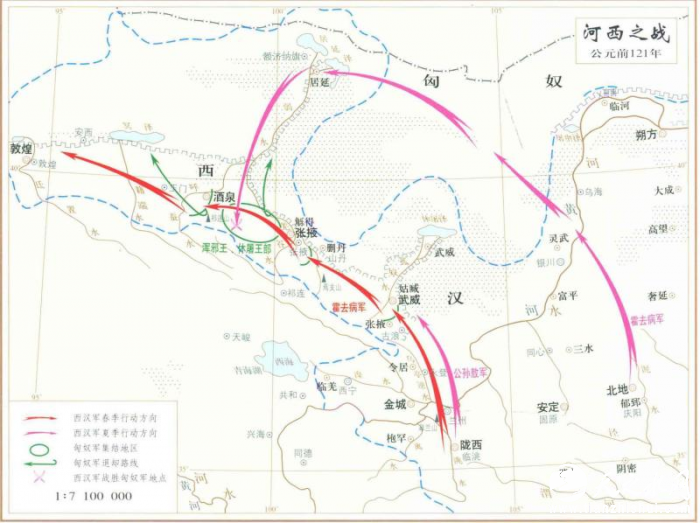 一方面,汉武帝曾两次派遣张骞出使西域,希冀“厚赂乌孙,招以东居故地”共同抗匈,以断匈奴右臂。同时,武帝又派遣卫青、霍去病二人,前后多次与匈奴在河西走廊和“河南地”与匈奴展开争夺。尤其是元狩二年(前121)夏天,骠骑将军霍去病与合骑侯公孙敖分别从北地和陇西出发,南北合围匈奴左贤王部众取得了巨大成功。据《史记·匈奴列传》记载,此次征伐“得胡首虏三万余人,裨小王以下七十余人”,对匈奴造成了致命打击。随后,匈奴内部发生叛乱,匈奴浑邪王杀休屠王后归降于汉。至此,河西走廊已为西汉政府完全掌控。