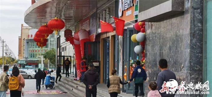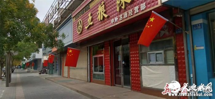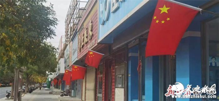 在城区的主次干道、临街商铺、学校等地都悬挂起一面面飘扬的五星红旗。蓝天白云下的“中国红”,庄严而又靓丽,扮靓了整座城市。