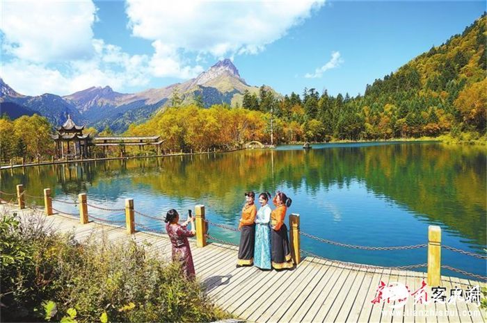 游客在宕昌县官鹅沟泽荡措拍照留念。新甘肃·甘肃日报通讯员刘辉