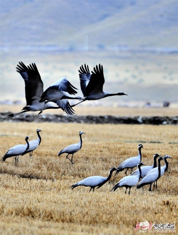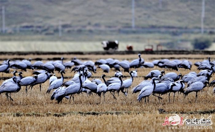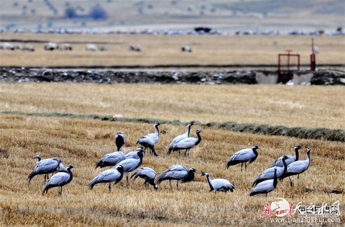 金秋时节,天高云淡。在肃南裕固族自治县皇城镇夏日塔拉草原,微风拂动,芦花飘荡,在金黄芦苇之中,蓑羽鹤在其中悠闲地踱步。湿地内外的芦苇荡、草丛、湖面上、附近的农田地里,随处可见蓑羽鹤觅食的身影。