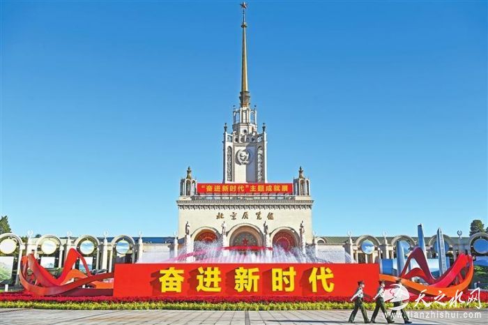 金秋时节的北京,碧空如洗,北京展览馆门前,红色波浪形雕塑和巨型喷泉,把“奋进新时代”五个大字衬托得庄重夺目。