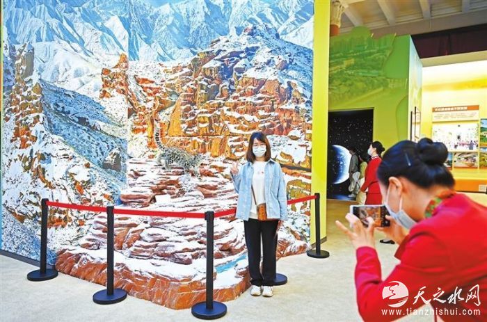 观众在甘肃单元展出的祁连山雪豹模型前拍照留念。
