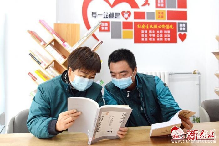 10月11日 ,邮政快递员、环卫工在甘肃省新就业形态劳动者驿站天水市秦州区、麦积区站点读书、休息。