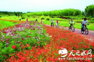 在甘肃省张掖奥林匹克森林公园,骑行爱好者在湖畔绿道上乐享生态美景。杨永伟摄/光明图片