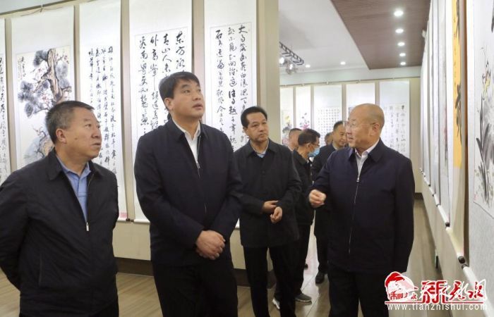 新天水讯【记者 童强】10月18日,由天水市退役军人事务局主办的“翰墨庆盛会 丹青赞军辉”庆祝党的二十大胜利召开暨全市第三届退役军人书画展在天水市文化馆开展。市委副书记、统战部部长杨小平宣布展览开展,天水军分区政委石明致辞,市人大常委会副主任申君明、市政协副主席崔玉军出席开展仪式。