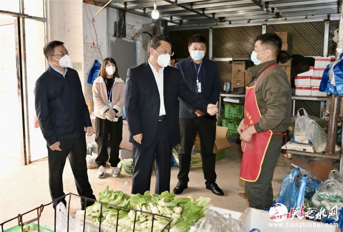 在兰州新区国源农贸副食品批发市场,任振鹤与市场商贩亲切交谈,看价格、问货源,了解物流保畅和市场防疫等情况。他强调,保供稳价是民生底线,是疫情防控工作的重中之重,农贸市场等既是保障供应的重点基地,也是容易输入疫情并导致疫情扩散的高风险之地,容不得丝毫闪失。要进一步拓宽货源渠道,增强市场供给,做好“菜篮子”产品终端配送,畅通快递外卖等物流末端微循环,切实满足群众生活需求。各类市场要督促经营主体严格落实防疫责任,抓好常态化核酸检测,规范个人防护,加强环境消杀,坚决将疫情风险堵在门外。