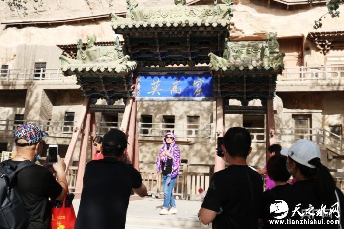 游客在敦煌莫高窟小牌坊拍照留念(央广网发 李红军 摄)