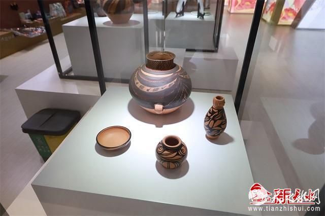 在灯光映照下,蕴含古朴之美的大地湾彩陶在省文旅厅组织搭建的人文交流——“中国旅游”甘肃展台天水展区展出,吸引了众多目光。由秦安县康坡陶艺农民专业合作社提供的8件大地湾彩陶,其瓶身图案的韵律节奏及对称均衡的形式完美呈现了彩陶艺术作品的魅力,为甘肃展台增添了厚重的人文气息;甘谷麻鞋、收纳盒等文创产品是甘肃雅路人麻编工艺制品发展有限公司研发的既有本土文化元素又具有美学颜值的新产品,一经亮相,就吸引了参展嘉宾游客纷纷观赏询价。