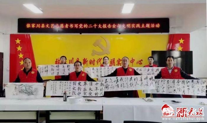 以“文艺创作”为突破,全面提升群众精神面貌。依托各级文艺志愿服务队伍,把党的二十大精神融入文艺创作中,通过文艺展演活动,用特有的艺术表演,欢快明朗的节奏、优美的歌舞、朗朗上口的快板、激情饱满的诗歌、幽默诙谐的小品,让老百姓听得懂、看得懂、能领会、可落实,不断丰富基层群众文化生活,在潜移默化中将党的声音和关怀传递到百姓心间。同时,文艺志愿者还开展以书写党的二十大报告金句为主题的文明实践主题活动,以书言志、以画寄情,充分表达对党和国家的真挚热爱和无限深情,以及对美好生活的祝愿,让大家在书画交流中感受爱党爱国之情,让党的二十大精神走进群众、深入人心。