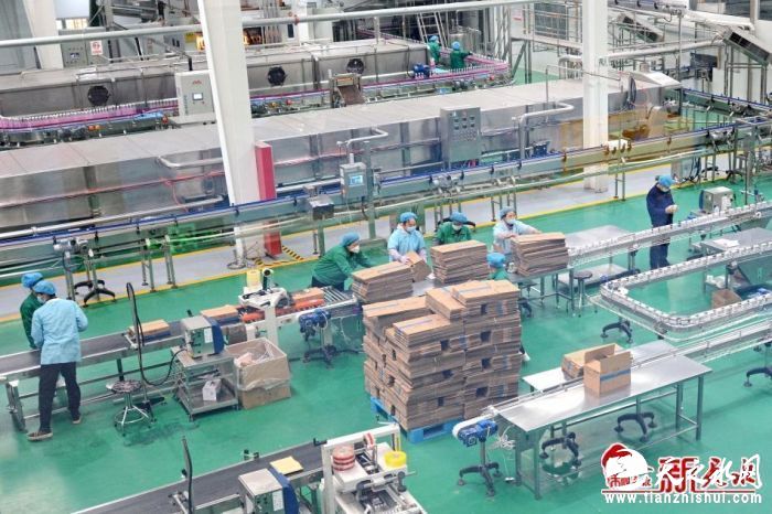 近日,记者在位于麦积区东柯河工业园区的天水长城果汁集团生产车间里看到,全自动化生产线高速运转,智能化机械臂来回转动,工人在生产线上忙着打包、装箱,这些新鲜出炉的饮品将销往欧美、中东、东南亚等地区。