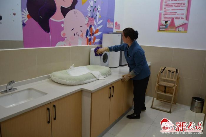“我们商场三楼和四楼都有母婴室,像周末、节假日客流量大时使用频率非常高,顾客一个接着一个。有的是带小孩进去喂奶,也有给孩子换纸尿裤的,每出来一位顾客我们都会打扫,像纸尿裤、湿巾、隔尿垫这些物资也都是免费提供。”天水万达广场保洁驻场经理闫彦霞说。