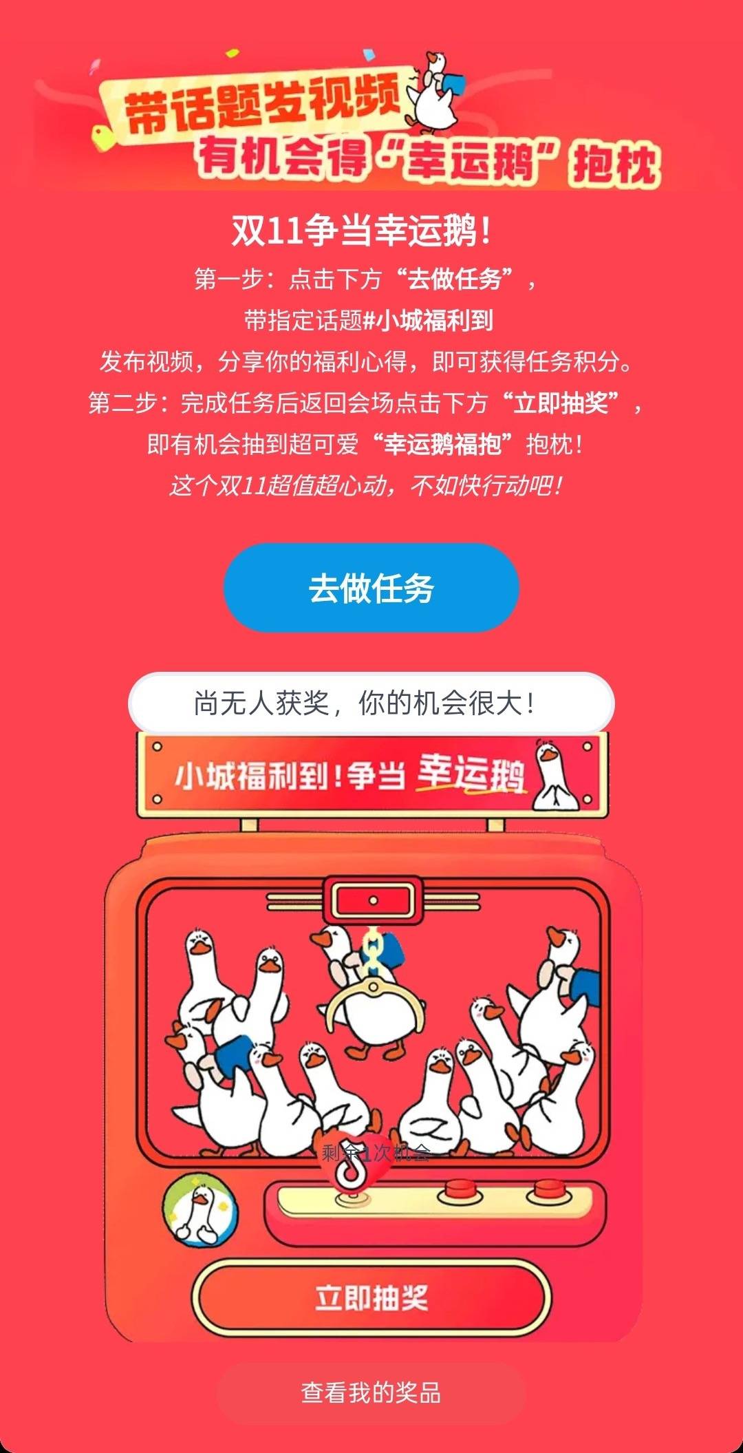 活动期间带话题#小城福利到 发布视频分享福利心得,晒出你的冬日小城生活,既有机会抽取“抓大鹅抱枕”,为冬日再添温暖Buff!速来争当“幸运鹅”,吸引更多好运气~