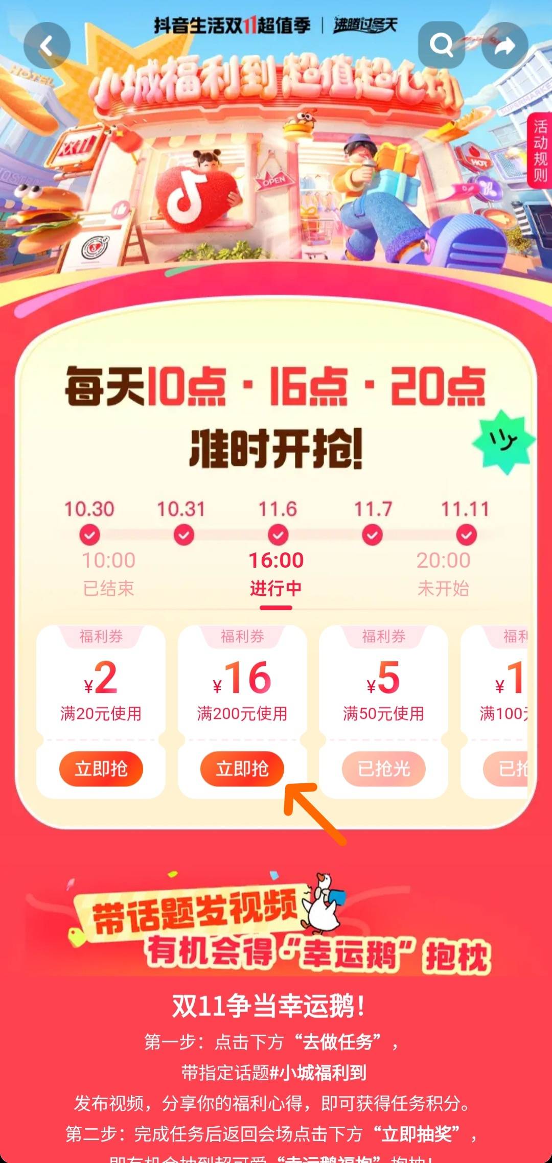 除了抢券包,领福利,此次抖音生活双11超值季还联手了热门IP“抓大鹅”,推出了争当“幸运鹅”站内活动!