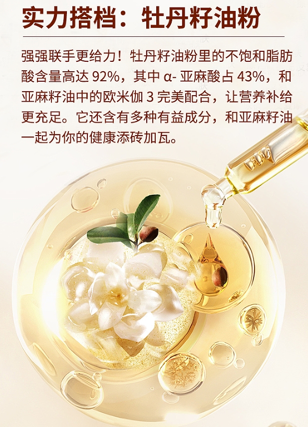 牡丹籽油粉以高达92%的不饱和脂肪酸和43%的α-亚麻酸占比,与亚麻籽油形成协同增效,强化营养层次。天然活性物质成分同时补充必须矿物质和维生素,覆盖脑力、血管、肠道等多重层面。其中添加低聚果糖作为益生菌“口粮”,显著促进肠道内有益菌群增殖,支撑每日消化系统轻松运转。