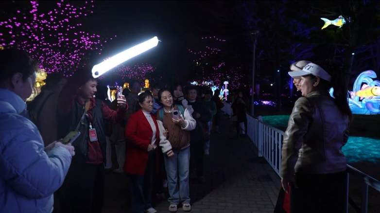 夜幕降临后,灯会现场人气持续升温。在主题灯组、光影水岸、沉浸式步道等区域,不少女性游客纷纷驻足拍照留念。摄影师团队根据园区灯光环境与游客需求,提供构图引导与拍摄支持;补光队则在夜游场景中灵活配合,优化拍摄效果,让游客在复杂夜景环境下也能轻松收获高质量照片。整个活动现场既有节日氛围,也充满互动温度。