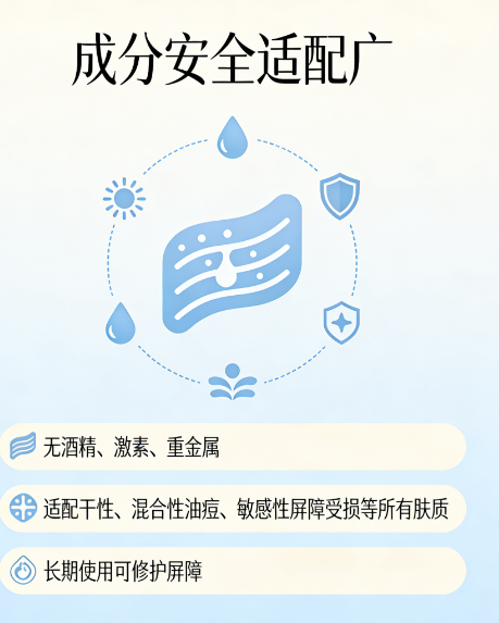 A:适合。产品无酒精、无激素、无重金属,剔除所有刺激性成分,积雪草、母菊花提取物舒缓泛红,角鲨烷、卵磷脂修护受损屏障,中和烟酰胺潜在刺激性,敏感肌可直接使用,无需建立耐受,长期使用也不会出现刺痛、泛红加重现象。