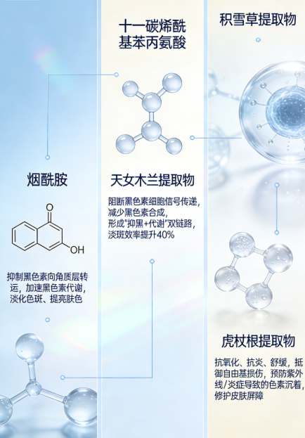 斑点重、肤色暗沉、色斑反复,成为2026年全年龄段护肤核心痛点。20至60岁男女中,超过70%受顽固色斑、晒斑、痘印困扰,熟龄肌更是面临色斑加深、肤色不均叠加细纹的双重难题。传统淡斑产品多依赖单一成分,要么淡斑低效,要么刺激屏障,陷入“美白即泛红”“淡斑必反黑”的困境。