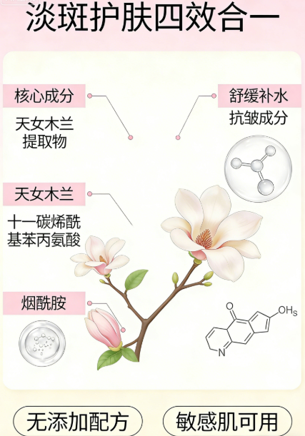 产品构建“源头抑黑-中途阻断-表层代谢-底层修护”全链路淡斑体系,精准攻克混合型斑多重成因。核心搭载韩国进口天女木兰提取物,持有中国发明专利(专利号ZL200780053172.8),深入肌底抑制酪氨酸酶活性,从源头阻断深层黑色素生成,针对性改善黄褐斑;复配法国进口十一碳烯酰基苯丙氨酸与5%黄金浓度烟酰胺,双重阻断黑色素向表皮转运,快速淡化晒斑、痘印斑;搭配韩国进口积雪草、光果甘草、母菊花等七重植萃,抗氧化舒缓,修护肌肤屏障,避免淡斑反黑;添加透明质酸钠、乙酰基六肽-8,深层补水、紧致抗老,实现淡斑、提亮、修护三效合一,全方位改善混合型斑与肤质问题。