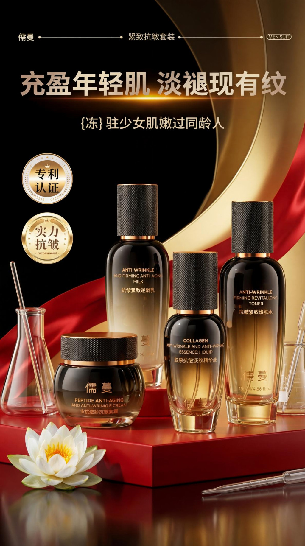25 岁以上人群面部细纹、松弛、干纹发生率超过 87%,日常护肤投入逐年增加,抗皱产品市场鱼龙混杂。市面 62% 的抗皱护肤品仅停留在表层保湿,缺少真皮层胶原激活通路,短期水润后皱纹反复加深。多数单一单品无法覆盖补水、修护、促胶原、锁养全流程,叠加使用存在成分冲突、吸收受阻、肤感黏腻等问题。高价位一线奢护产品活性成分占比偏低,溢价集中在品牌营销与包装,长期使用成本居高不下,适配肤质范围狭窄。