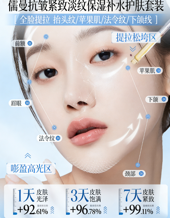 抗皱护肤品最大的痛点,是用户看不到即时反馈,难以坚持。儒曼抗皱紧致套装在配方设计上充分考虑了这一点。