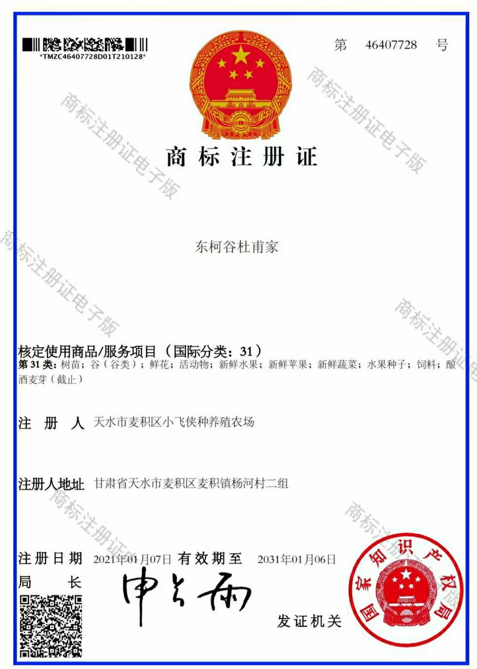 2021年,“东柯谷杜甫家”商标获国家知识产权局正式注册。农场依托自有种植基地,打造特色农产品产业链,目前种植花牛苹果5亩、富士苹果16亩,同时发展乌龙头、樱桃、中药材柴胡等特色种植。品牌主打微商销售渠道,凭借优质产品与文化底蕴,去年全年就将花牛苹果、黄元帅、本土水蜜桃等农特产品销往北京、福建等地,销量达6000多箱。