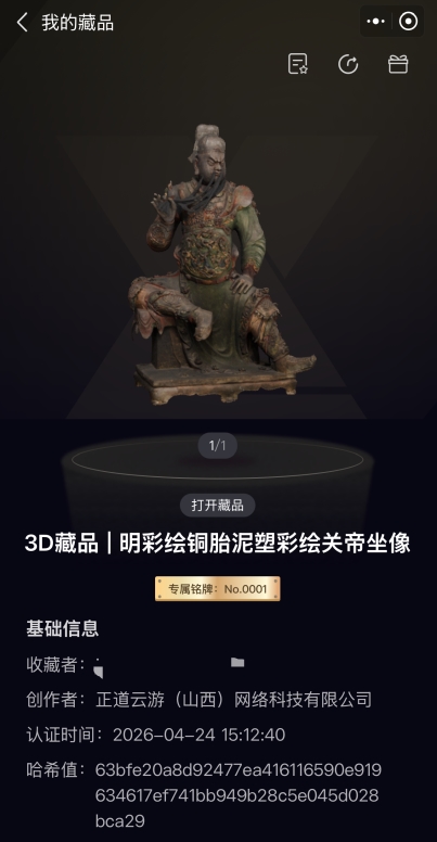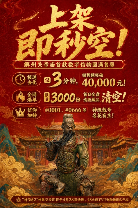 (摘要)2026年4月24日,由运城市解州关帝庙文物保护所监制授权、山西云时代技术有限公司与正道云游(山西)网络科技有限公司联合发行的“明彩绘铜胎泥塑彩绘关帝坐像”数字藏品,在京东灵稀平台正式上线发售。发售当日,3000份限量数字资产即宣告全部售罄,圆满收官!作为该项目的全案运营方,正道云游通过精细化社群运营与前沿数字化技术,助力项目取得亮眼的市场反馈,为文旅IP的数字化转型提供了创新实践参考。